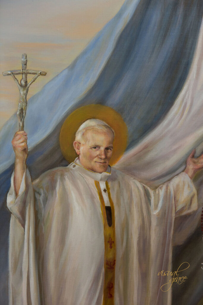 Totus Tuus, original art by Kate Capato, tells the story of St. John Paul II’s total trust to Mary. In his right hand, he bears the cross of Christ, letting Jesus lead him forward. In his left, the rosary anchors him, and reveals his devotion to Our Lady. He stands under her mantle, in her grace.